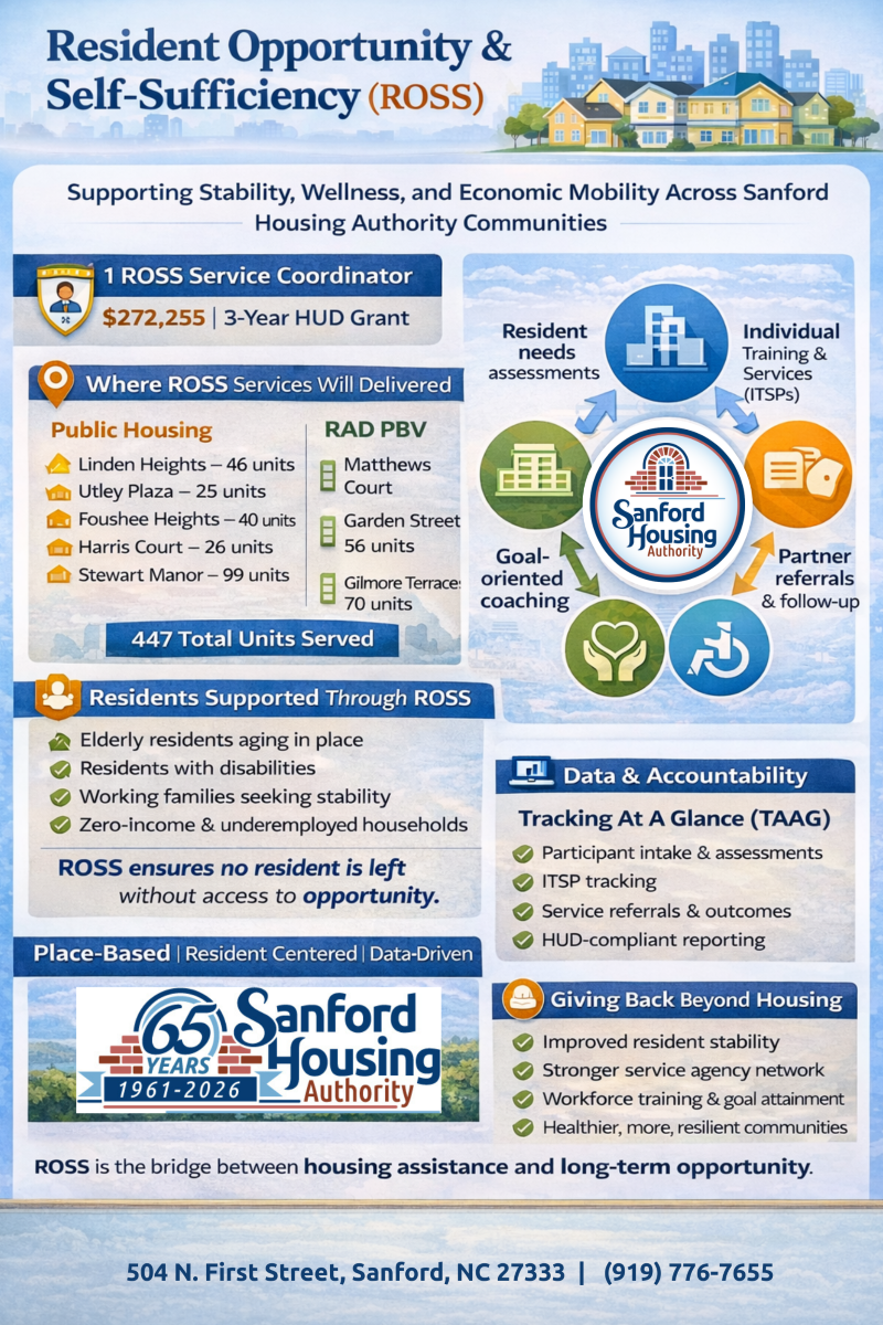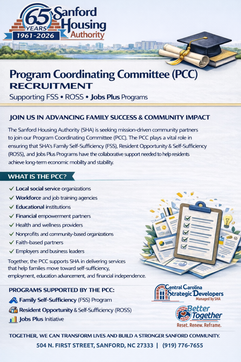 SANFORD, NC, UNITED STATES, February 9, 2026 /EINPresswire.com/ -- The Sanford Housing Authority (SHA) is advancing its resident-centered transformation with three pivotal developments: a milestone Family Self-Sufficiency (FSS) graduation on January 30, 2026; submission of a Resident Opportunity & Self-Sufficiency (ROSS) grant application; and the launch of a robust Program Coordinating Committee (PCC) recruitment campaign to expand services and partnerships across FSS, ROSS, and future Jobs Plus initiatives.